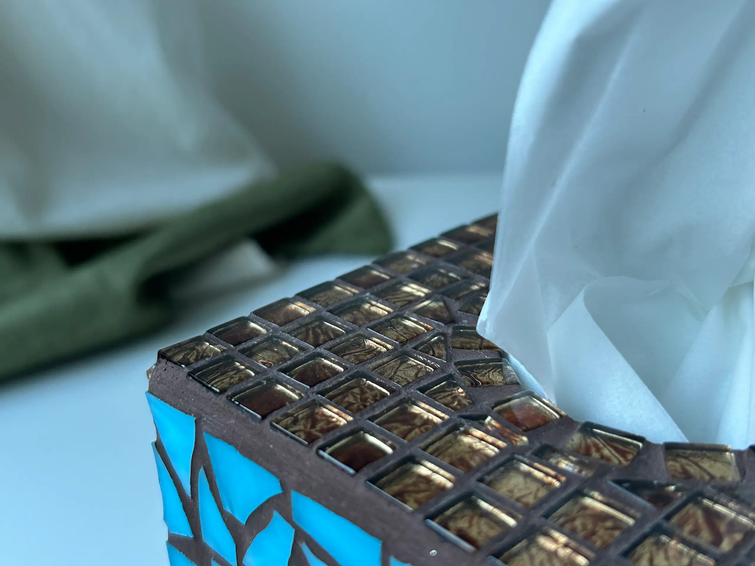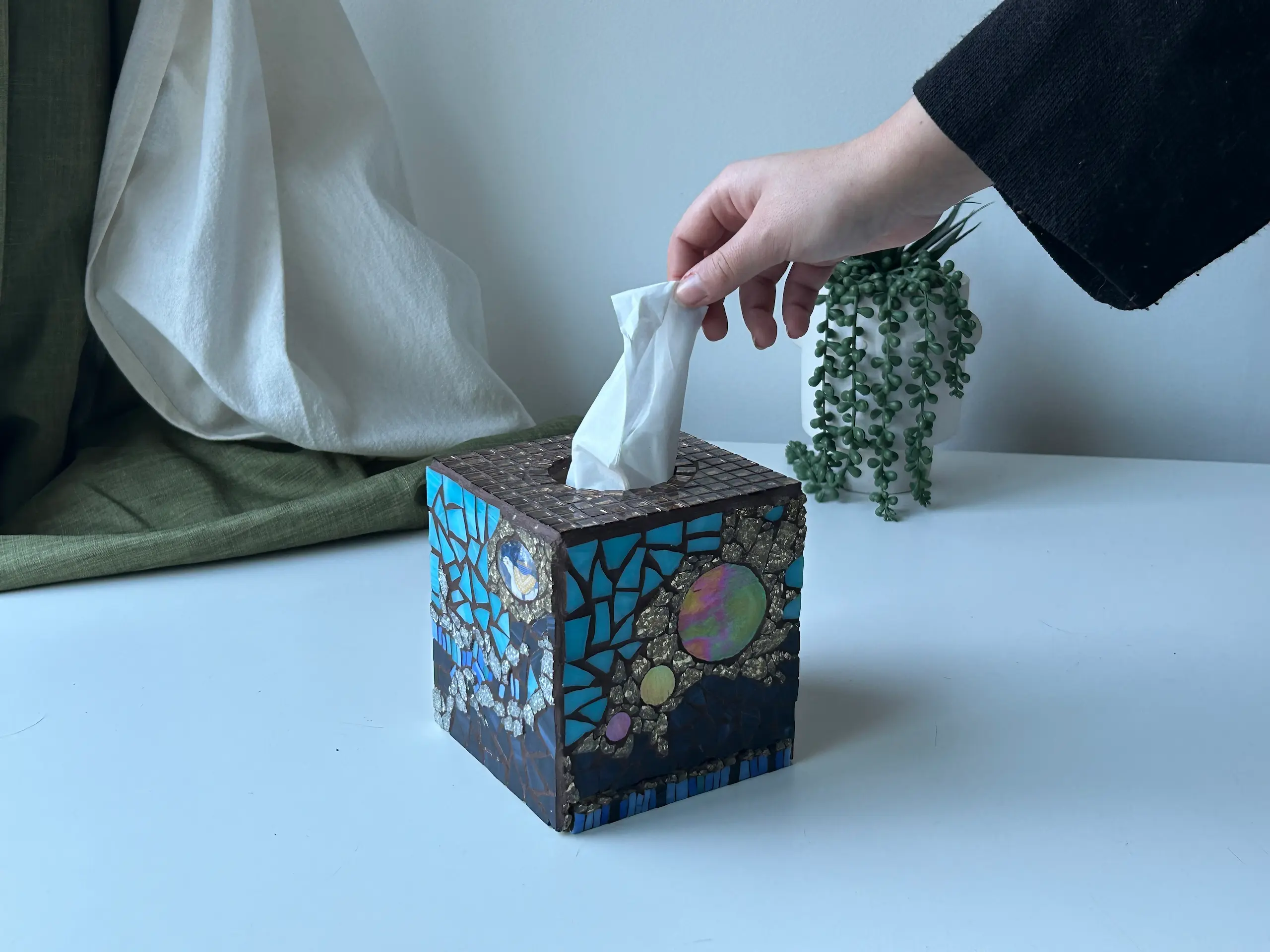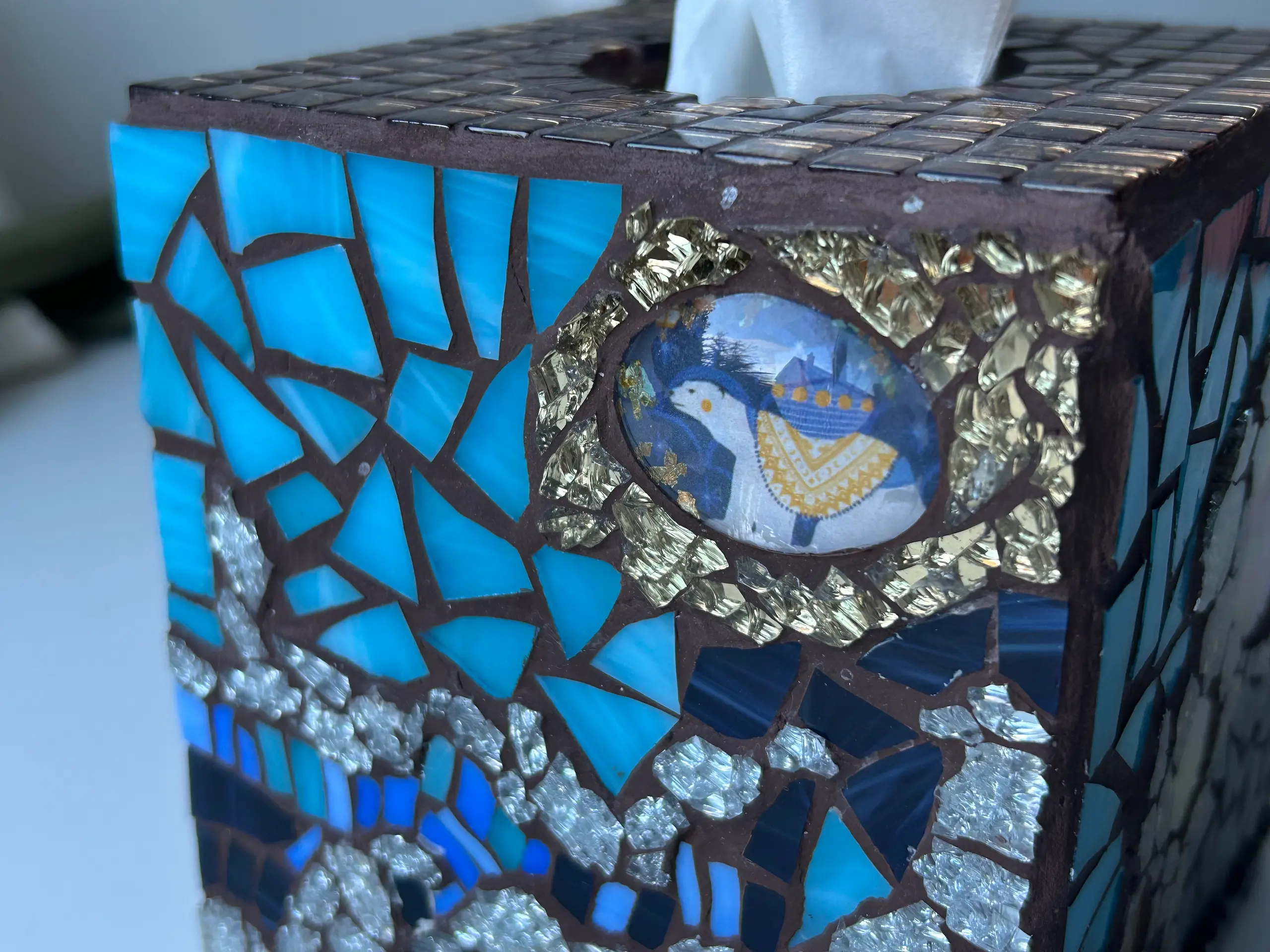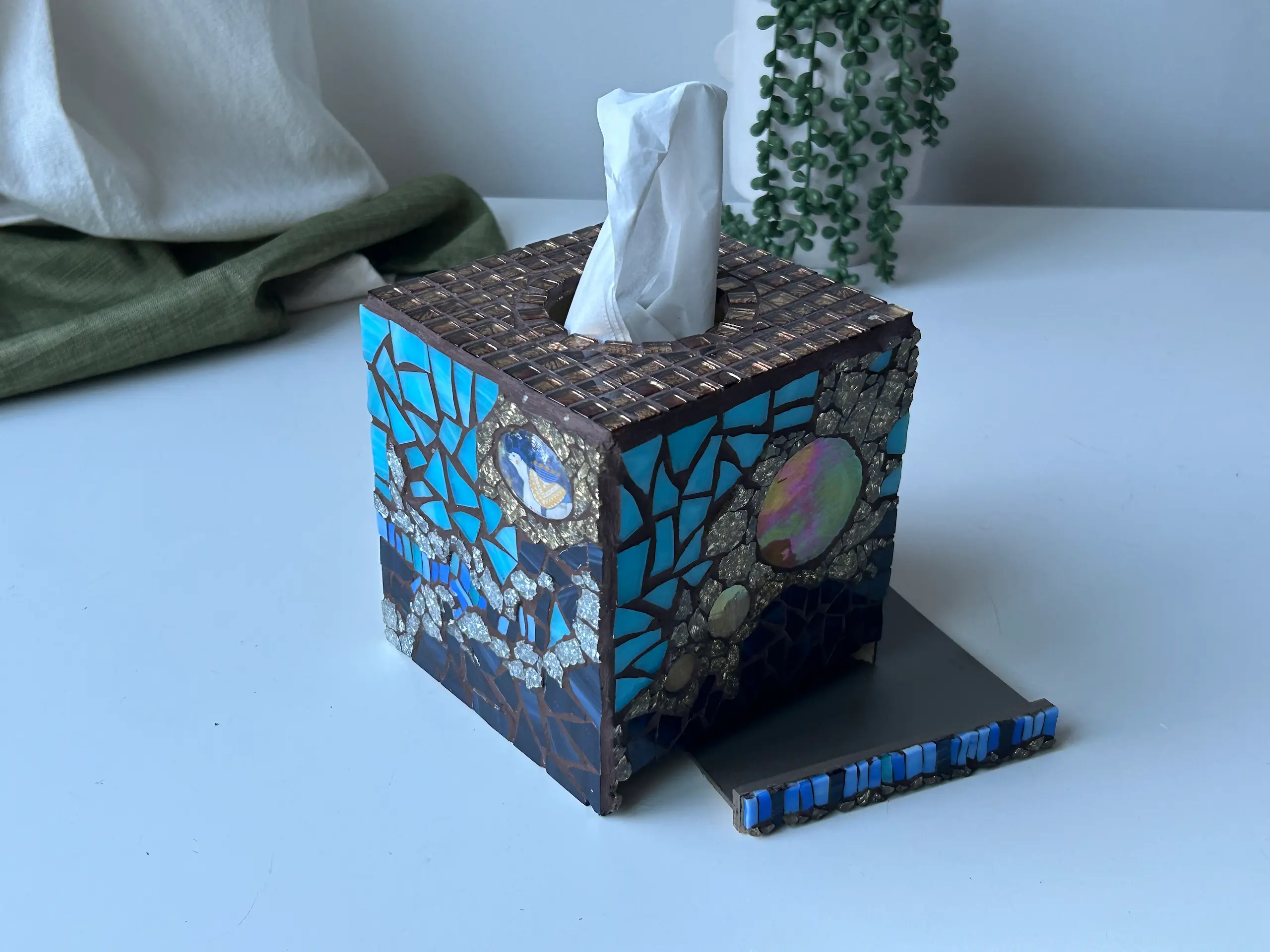 Au Pays Bleu, la neige ne fond jamais. Le ciel, la glace et même les ombres sur la neige se parent de nuances bleutées, créant un univers silencieux et enchanteur. Au cœur de ce monde vit Noko, un ours polaire un peu différent. Un jour, lors d’une promenade sur la banquise, il découvre une lumière plus brillante que les autres, tombée du ciel et prisonnière de la glace. Cette lueur mystérieuse illumine l’horizon et rend le monde encore plus bleu. Cette MOSAbox s’inspire de ce conte poétique : un décor doux, onirique et apaisant, où le bleu devient une invitation au rêve et à l’évasion, pour une petite boîte à mouchoirs empreinte de magie et de douceur.